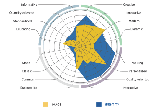 The yellow area is how this brand A is being perceived by the audience. the image. The blue area is how brand A wants to be seen, the identity.